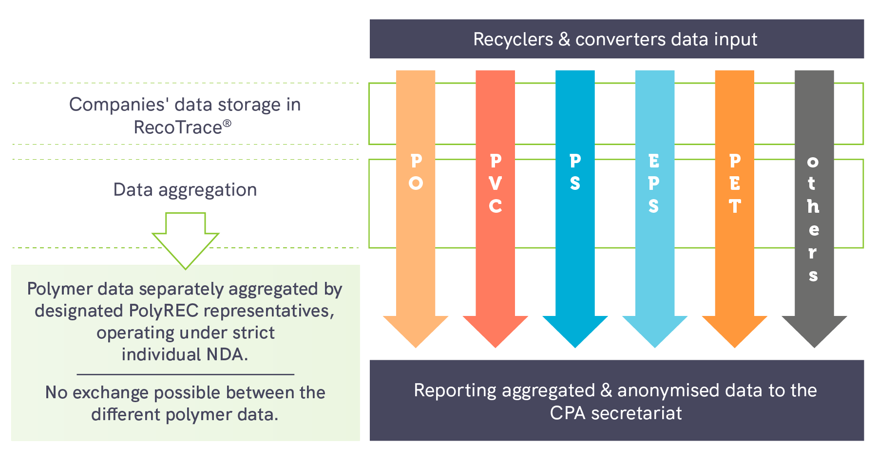When companies use RecoTrace®, their data are stored in different compartments according to their polymer types. Polymer data are then separately aggregated by their designated PolyREC® representatives, under strict individual NDA, to ensure data confidentiality and prevent any exchange of information between polymers in alignment with EU Competition Law.